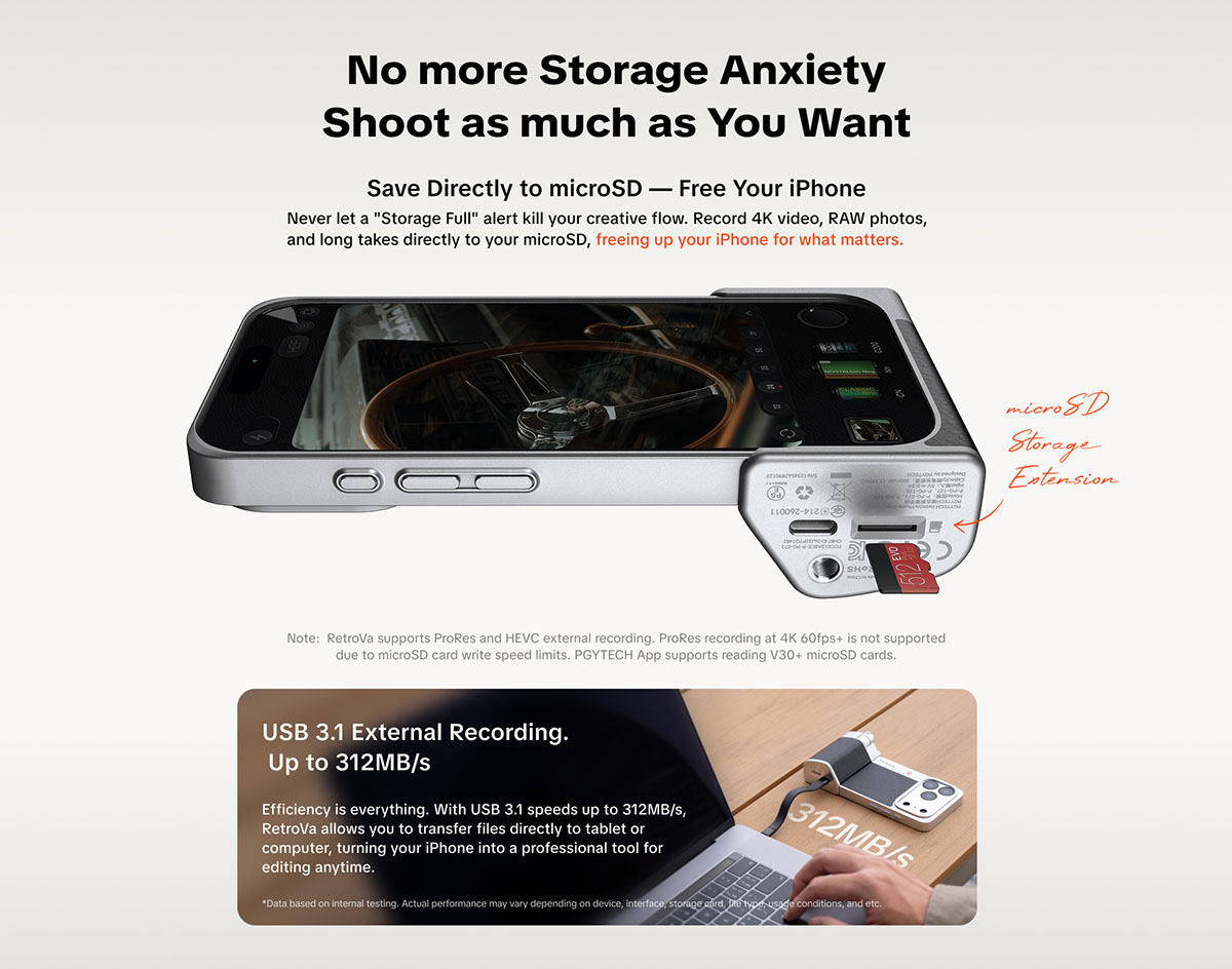Bên cạnh khả năng mở rộng tiêu cự, PGYTECH RetroVA Ultimate Set còn tối ưu hóa quy trình làm việc chuyên nghiệp thông qua khả năng lưu trữ và kiểm soát hình ảnh tuyệt vời. Với khe cắm thẻ nhớ microSD tốc độ cao (312MB/s) tích hợp sẵn trên tay cầm, bộ set cho phép ghi hình định dạng ProRes trực tiếp vào thẻ nhớ ngoài, giúp giải quyết triệt để bài toán dung lượng trên iPhone. Ngoài ra, bộ sản phẩm còn đi kèm hệ thống kính lọc (filters) đa dạng, cho phép người dùng can thiệp vào ánh sáng và hiệu ứng hình ảnh ngay tại thời điểm bấm máy, mang lại những thước phim đậm chất cinematic và chuyên nghiệp mà không cần hậu kỳ phức tạp.