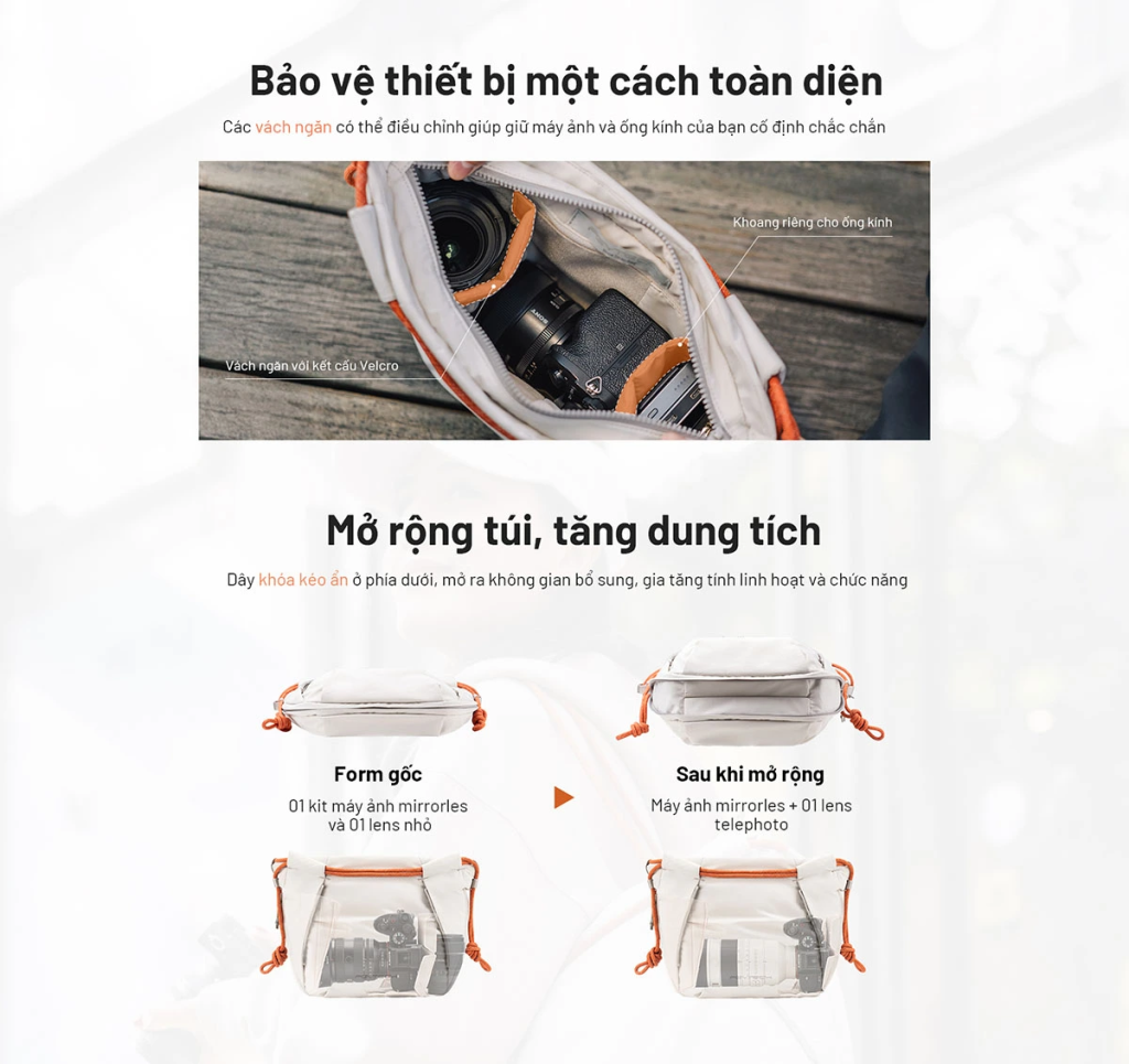 Đây không chỉ là một công cụ chứa đồ, mà còn là tuyên ngôn cá tính của riêng bạn. Bạn có thể biến tấu nó thành một chiếc túi xách tay (handbag) điệu đà, túi đeo chéo năng động, hay dùng như một túi lót chia ngăn (packing cube) tiện lợi. Độc đáo hơn, bạn có thể tháo rời dây đeo vai của túi để gắn trực tiếp vào máy ảnh, mang lại sự linh hoạt tối đa khi tác nghiệp.